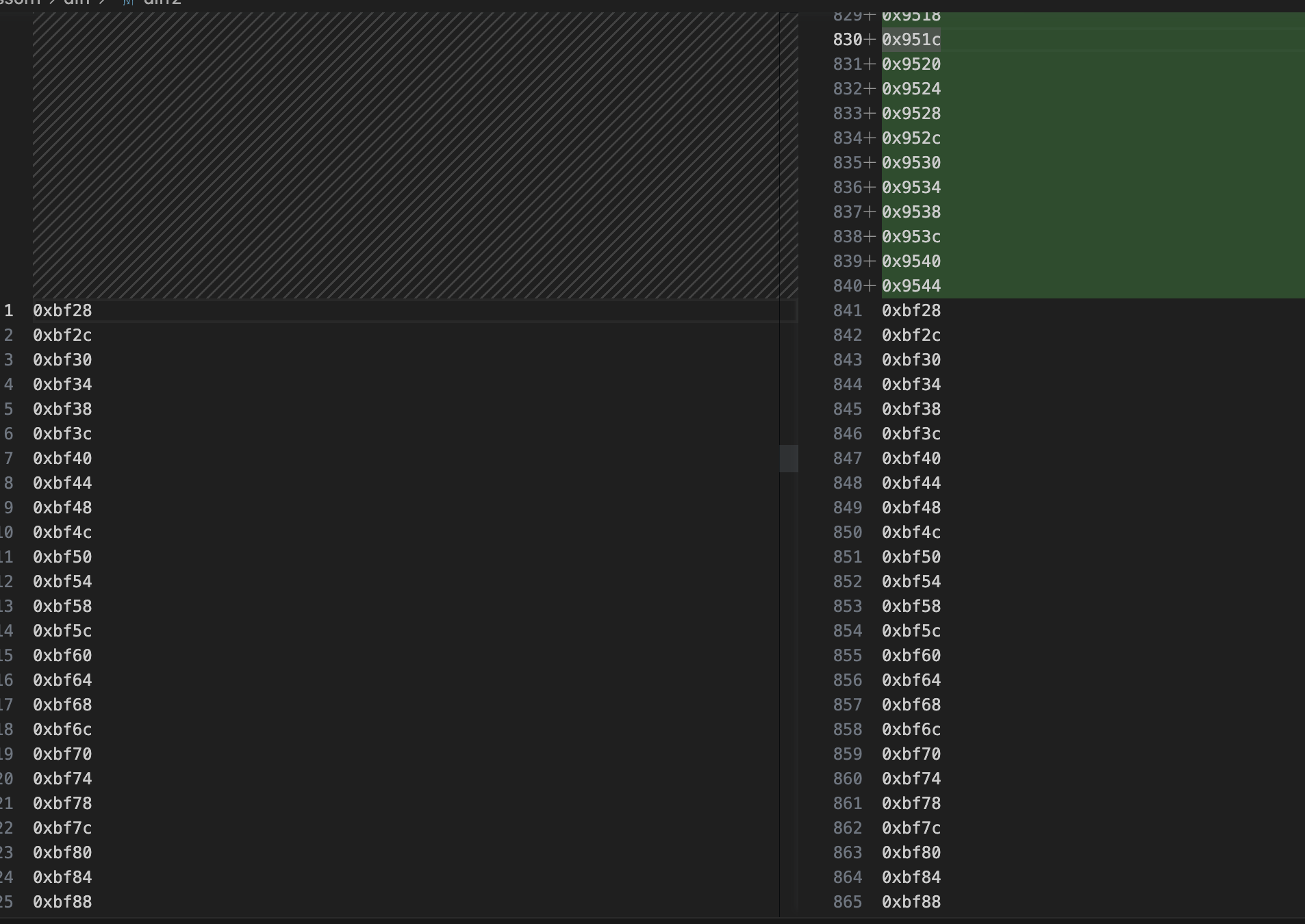分别执行完0000000000000000,f000000000000000,fl00000000000000,在vscode中对比日志,发现后者多了很多执行地址:
