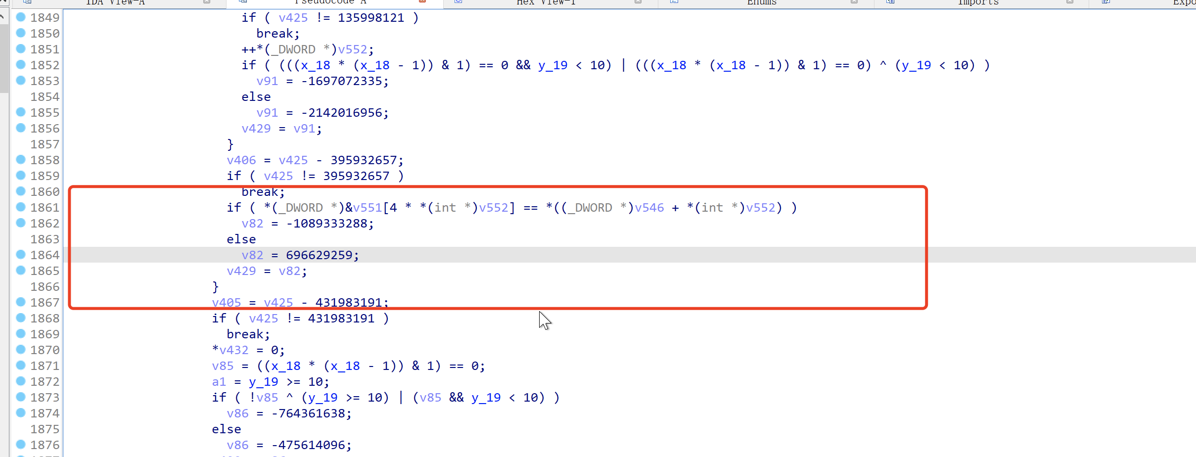 F5下,可以看到根据判断结果,赋值v429,这时候再往下看看: